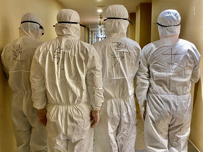 这样的默默坚守,在一线服务人员身上更得到充分彰显。在红区工作的13名服务人员,每天要穿着厚厚的防护服为集中观察人员送餐、送物品、搞清洁卫生。每天,他们要全副武装穿上防护服,并严格按照要求进行消杀。要一个房间一个房间地配送餐食,送餐完毕,还要一个房间一个房间地收纳垃圾。由于防护服不透气,刚一行动起来,他们已经浑身是汗,但是他们每次都保质保量按时完成了任务。请记住他们的名字:崔涛、陈宇、翟明星、于艳梅、任艳丽、吴迪、崔加伦、刘克云、孙家俊、单雪芳、杜迪、杨鲁琦、侯迪。