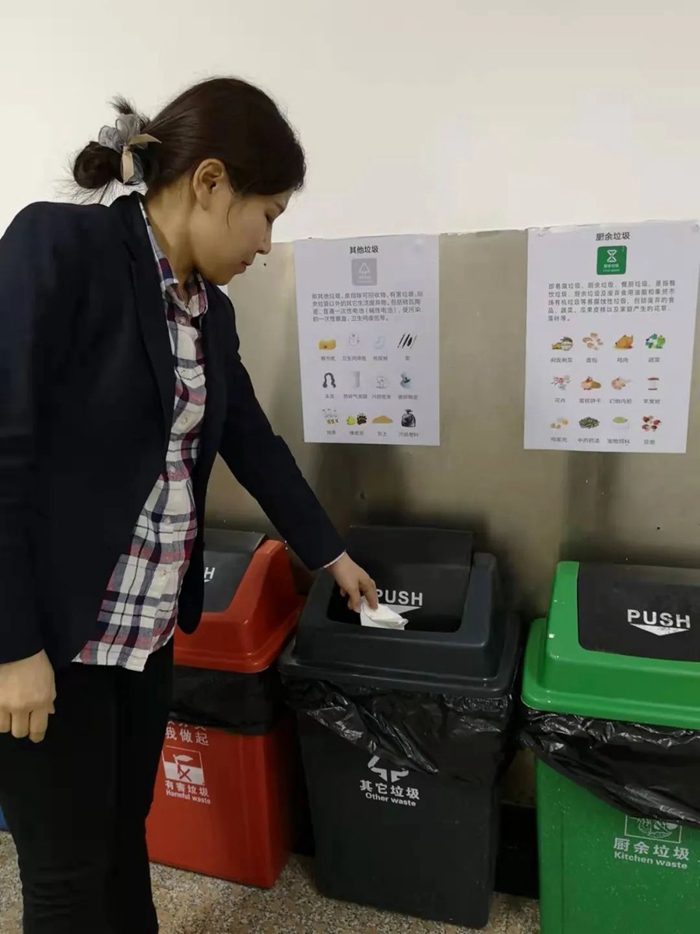 华腾天海在办公区和公共区域合理配备“四桶”,张贴垃圾分类指引和宣传海报,组织全员参与桶前值守,积极开展垃圾分类小妙招征集活动。当前,华腾天海干部职工正积极参与到垃圾分类示范单位创建活动中,多措并举达到了垃圾分类知识推广和普及的目的。